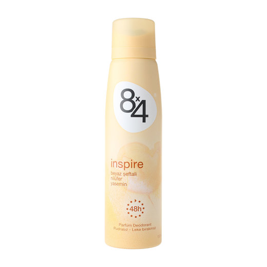 8x4 eşsiz ve kalıcı parfüm kokularını gün boyu süren deodorant korumasıyla birlikte sunar. Inpire'ın sofistike kokusu, beyaz şeftalinin meyveli ve ferah açılışıyla başlar, yasemin ve nilüfer çiçeklerinin zengin notlarıyla son bulur.