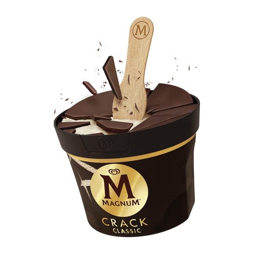 Magnum Crack Classic, pürüzsüz ve yoğun kıvamlı vanilyalı kremanın eşlik ettiği çıtır Magnum çikolata parçalarıyla size bambaşka bir dondurma keyfi sunuyor. Magnum Crack Classic, Magnum’um klasik tadını kaşıkla tadımlayabilmeniz için özel bardağında geliyor.