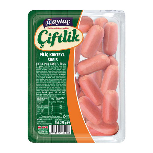 Aytaç Sosis Çiftlik 225 gr tavuk etinin hamur haline getirilmesi ile üretilir. İyi bir protein kaynağı olan sosis, kahvaltı sofralarının vazgeçilmezleri arasında yer alır.