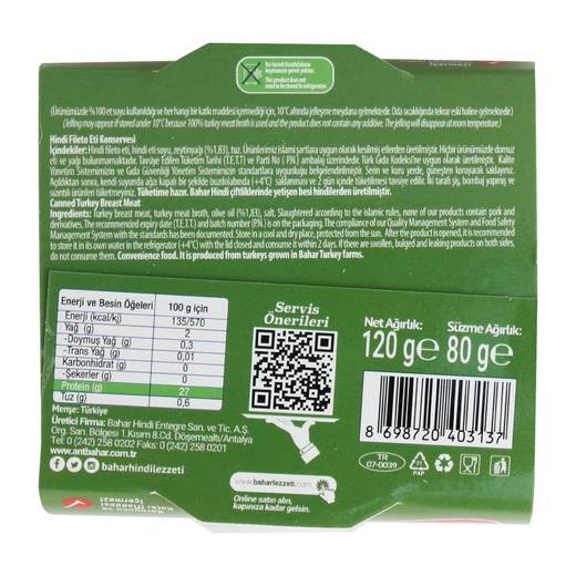 Zeytinyağlı %100 Göğüs Pişmiş Hindi Eti, koruyucu içermez. Trans yağ içermez.