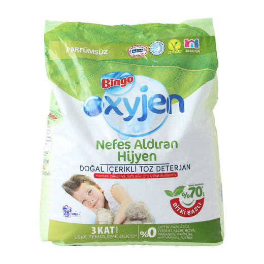 Bingo Oxyjen Doğal içerikli Toz Deterjan, %70 bitki bazlı formülü ile çamaşırlarınıza doğal koruma sağlar. %70 bitki bazlı formülü ile vegan sertifikasına sahiptir. Optik parlatıcı, fosfat, klor, boya, paraben, parfüm, hayvansal içerik içermez. Bu sayede de cilt hassasiyeti olan tüketiciler iç rahatlığıyla kullanabilir.