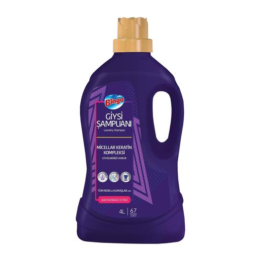 Bingo Giysi Şampuanı içeriğinde bulunan micellar ve keratin kompleksi kıyafetleri canlandırır ve yoğun parlaklık verirken kıyafetlerinizin ömrünü 2 kata kadar uzatır ilk günkü gibi korunmasına yardımcı olur.