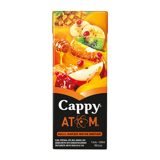 Konsantre ve pürelerden üretilmiş karışık meyve suyu en az % 50 (elma, portakal, kivi, muz, ananas, nar), su, şeker veya fruktoz-glikoz şurubu, asitliği düzenleyici (sitrik asit), aroma vericiler, bal (% 0,1), A vitamini.