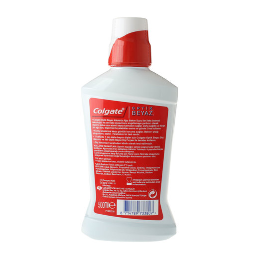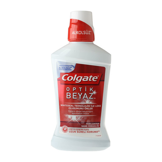 Colgate,Optik Beyaz ağız bakım suyu, leke oluşumunu bloke eden teknolojisi sayesinde dişlerin doğal beyazlığını korumasına ve yeni lekelerin oluşmasını önlemeye yardımcı olur. Alkol içermez.