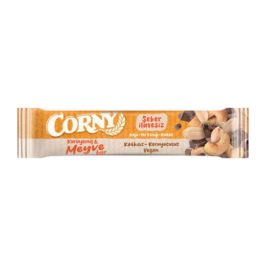 Doğal, şeker ilavesiz, katkısız, koruyucusuz corny kaju - Yer fıstığı - Kakao kuruyemiş ve meyve bar, %100 vegan formülü ile doğal meyve ve kuru yemişlerin lezzetli birleşimi.