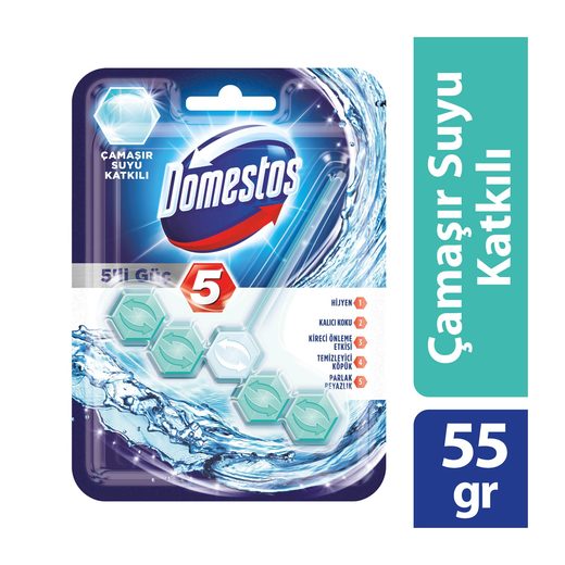 Yeni Domestos 5'li güç tuvalet bloğu,tuvaletinizi her sifonda temizler ve ferahlık hissi verir.Bu güçlü tuvalet blogu 5 güçlü temizlik faydası ile donatılmıştır.Temizleyici köpük,kireç önleme,kalıcı koku,parlak beyazlık,hijyen.