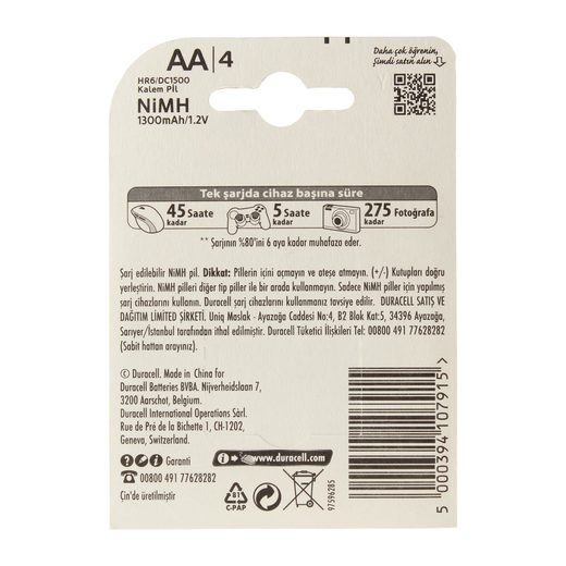 Duracell Şarj Edilebilir AAA piller 400 defaya kadar yeniden şarj edilebilir. Bu piller, kablosuz fare veya bebek telsizi gibi düzenli kullanılan cihazlar için uygundur.Kullanılmadıklarında 6 aya kadar şarjlı kalırlar. Ek olarak, Duracell piller için 3 yıl dayanma garantisi mevcuttur.