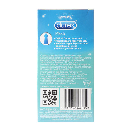 Temel korunma sağlayan Durex prezervatif. Paralel kenarlı, rezervuar uçlu. Şeffaf ve kayganlaştırıcı kremli doğal kauçuk lateks prezervatif.