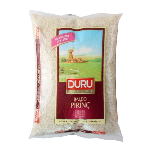 Baldo pirinç ülkemizde yetişen en iri taneli ve en kaliteli pirinç çeşididir. Balıkesir Gönen bölgesinde yetişen baldo pirinç ağırlıklı olarak pilavlarda kullanılmaktadır.Duru, en taze ve en kaliteli baldo pirinçleri hasatında özenle seçerek ISO 22000, IFS ve BRC sertifikalarına sahip fabrikalarında uzmanlıkla paketler. Her tanesinde aynı