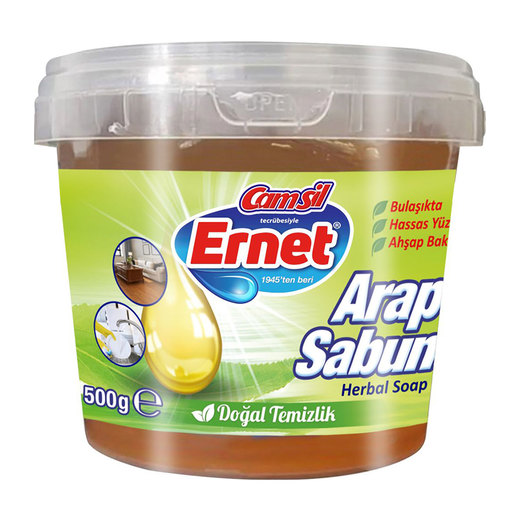 Ernet arap sabunu, yeni ve üstün formülü ile ev ve iş yerlerinizdeki her türlü temizlikte güvenle kullanabileceğiniz doğal bir üründür. Tüm yüzeylerde temizlik ve doğal bir parlaklık sağlar.Bulaşık,duvar,çamaşır,koltuk,halı,araba ve tüm zeminlerin temizliğinde güvenle kullanabilirsiniz.Banyo ve tezgahlarda etkin temizlik sağlar.
