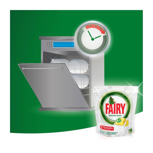 %100 yağda bile etkili Fairy Hepsi Bir Arada Bulaşık Makinesi Kapsülü ile aradığınız pırıl pırıl temizlik karşınızda. Özel formülüyle hızlıca çözülen Fairy, bulaşık makineleri için geliştirilmiş teknolojisi ve tasarımıyla bulaşıklarınızı tertemiz yıkar.