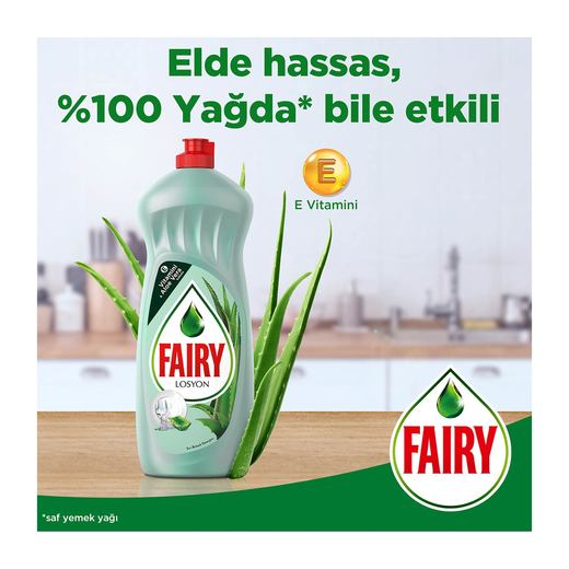 Fairy Losyon bulaşık deterjanı, Aloe Vera kokulu ve E vitaminli formülü ile yağ lekelerinde üstün performans sağlarken ellerinizi de koruyor. Konsantre yapısı, her damlada uzun ömürlü köpükler elde etmenizi mümkün kılıyor. Elde hassas, yağda %100 etkili.