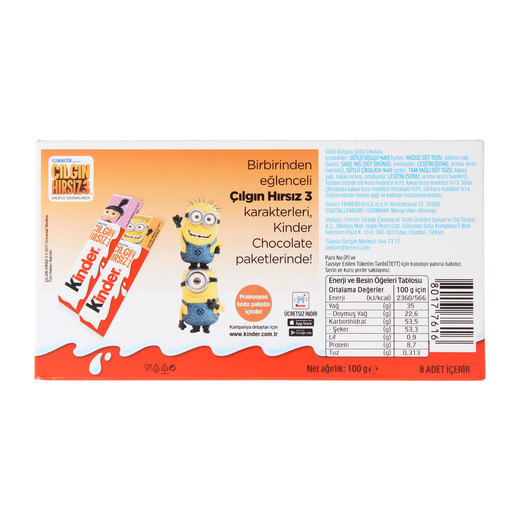 Kinder Chocolate çocuklar içindir. Kinder Chocolate sütlü çikolata (%40) ile sütlü dolguyu bir araya getirir. Anneler Kinder Chocolate’ı seçiyor çünkü sütlü dolgusu, ideal porsiyonları ve 40 yıllık Kinder uzmanlığıyla çocuklara özel üretiliyor. Çocuklar ise tadına bayılıyor. Kinder Chocolate ile anneler huzurlu, çocuklar mutlu.