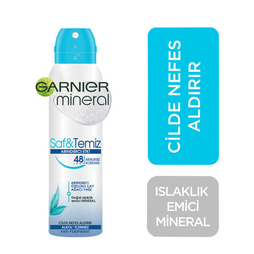 Garnier Mineral Saf&Temiz sprey, arındırıcı özellikli çay ağacı yağı içeriği ile, ter kokusuna karşı kaynağında etki ederek banyonun verdiği temizlik ve ferahlık hissini uzatan ilk 48 saat etkili anti-perspirant sprey deodorant.