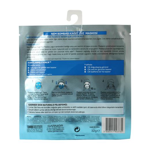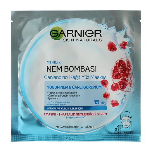 Normal ve Kuru ciltler için,yoğun şekilde nemlendirir,canlı bir görünüm kazandırır,ışıltı verir.Nem Bombası kağıt yüz maskesi, yoğun nemlendirici özelliğe sahip yeni nesil bir cilt bakım ürünüdür.Maskenin içinde bulunan konsantre formül, gerçek bir yenilik olarak nar özünü, hyaluronik asidi ve nemlendirici serumu bir araya getirir.