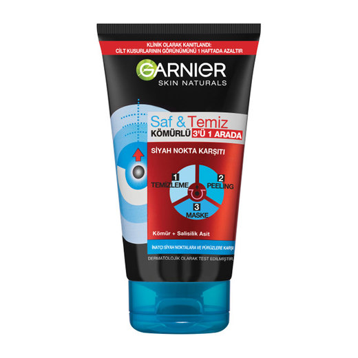 Garnier Saf ve Temiz Siyah Nokta Karşıtı Serisinden 150 ml ultra emici kömür formülü ile zenginleştirilmiş , salisilik asit ve yaban mersini özü içeren , temizleme , peeling ve maske özellikli, yağlanma ve pürüzlere karşı 3'ü 1 arada.