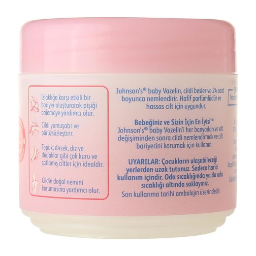 Johnson's vazelin,klinik testlerle yumuşaklığı kanıtlanmıştır. Hipoalerjeniktir.pH değeri ciltle uyumludur. Banyodan ya da alt değiştirmeden sonra sürüldüğünde, oluşturduğu tabaka sayesinde pişik oluşumunu engeller.