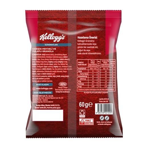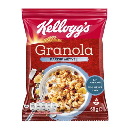 Lif kaynağı Kellogg's Karışık Meyveli Granola, fırınlanmış çıtır yulaf parçalarının kuru meyvelerle birleşmesinden oluşur.