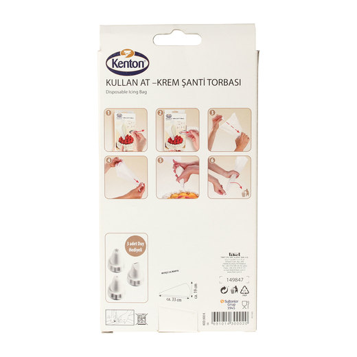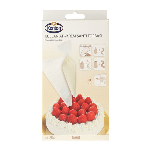 Kenton kullan-at krem şanti torbası pasta, tatlı, tabak süsleme için tasarlanmış, kullanımı kolay, hijyenik bir üründür.Paket içerisinde 20 adet tek kullanımlık krem şanti torbası ve 3 adet farklı şekiller yapmanızı sağlayacak duy bulunmaktadır.