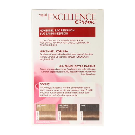 Bir saç boyasından sadece renk değil, daha fazlasını isteyenlerin tercihi,L'Oreal Paris'ten yeni Excellence. Yenilenen içeriğiyle saçınıza zengin renkler verirken, 3 aşamalı komple bakım sunar.Boyama öncesi seramid'le korur. Boyama sonrası kolajen'le yeniler.Boyama sırası pro-keratin'le güçlendirir.