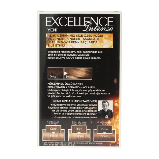 Bir saç boyasından sadece renk değil, daha fazlasını isteyenlerin tercihi,L'Oreal Paris'ten yeni Excellence. Yenilenen içeriğiyle saçınıza zengin renkler verirken, 3 aşamalı komple bakım sunar.Boyama öncesi seramid'le korur. Boyama sonrası kolajen'le yeniler.Boyama sırası pro-keratin'le güçlendirir.