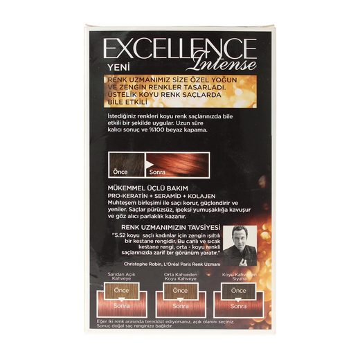 Bir saç boyasından sadece renk değil, daha fazlasını isteyenlerin tercihi,L'Oreal Paris'ten yeni Excellence. Yenilenen içeriğiyle saçınıza zengin renkler verirken, 3 aşamalı komple bakım sunar.Boyama öncesi seramid'le korur. Boyama sonrası kolajen'le yeniler.Boyama sırası pro-keratin'le güçlendirir.