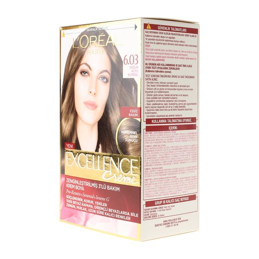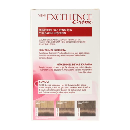 Bir saç boyasından sadece renk değil, daha fazlasını isteyenlerin tercihi,L'Oreal Paris'ten yeni Excellence. Yenilenen içeriğiyle saçınıza zengin renkler verirken, 3 aşamalı komple bakım sunar.Boyama öncesi seramid'le korur. Boyama sonrası kolajen'le yeniler.Boyama sırası pro-keratin'le güçlendirir.