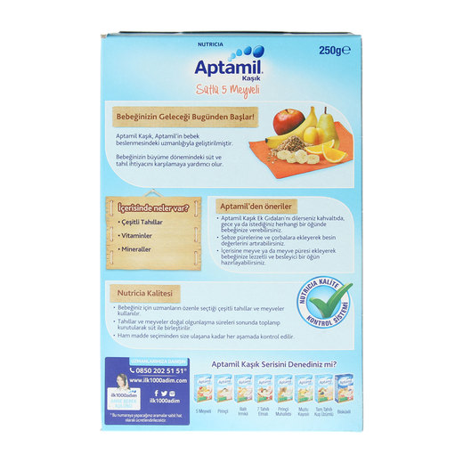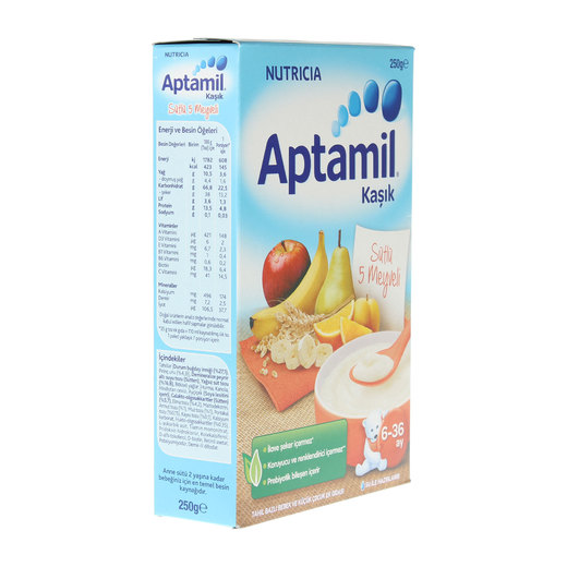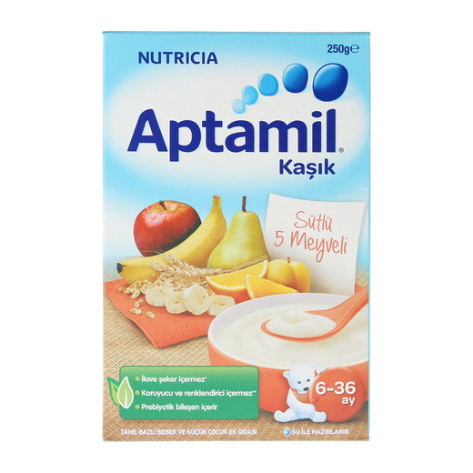 Aptamil Sütlü 5 Meyveli, bileşimindeki Aptamil Prebiyotik Lif Karışımlı Aptamil sütü ile bebeğinizin bağışıklık sistemi destekleyen bir kaşık mamasıdır. Ek besin dönemindeki bebeğiniz için lezzetli ve besleyici bir öğündür. Her kasesi bebeğinizin ihtiyacı olan tüm besinleri içerir.