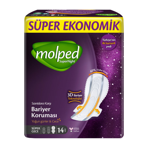 Molped Supernight pamuksu 3D bariyerleri sayesinde sıvıyı sızdırmazken, kademeli kilit sistemi ile sıvının geliştirilmiş emici tabakada kalmasını sağlar.%50 daha geniş arka yüzeyi ile gece ve gündüz %100 koruma ve güven sağlar.