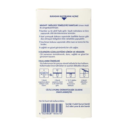 Nivea T bölgesi temizleyici bantlar limon asidi ile zenginleştirilmiştir bantlar su ile aktif hale gelir. Siyah noktalar ve kire yapışarak cildi derinlemesine temizler. Özel yumuşak dokusu sayesinde özellikle burun gibi düz olmayan bölgelere bile rahatlıkla yapışabilir.