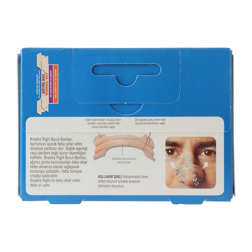 Breathe right burun bantları burnunuzu açarak daha rahat nefes almanıza yardımcı olur. Soğuk algınlığı veya alerjilere bağlı burun tıkanıklığını hafifletir. Breathe right burun bantları, ağzınızı yerine burnunuzdan daha rahat nefes almanıza olanak sağlayarak horlamayı azaltır hatta tümüyle ortadan kaldırabilir.
