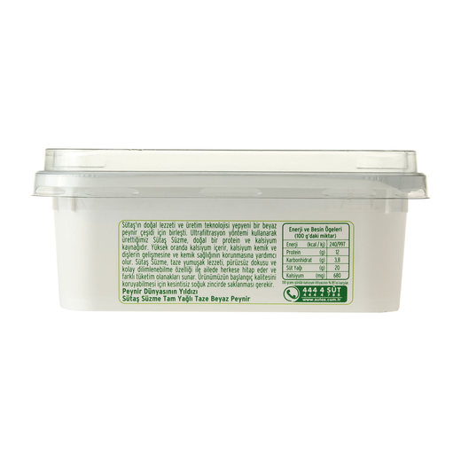 Sütaş süzme yumuşak lezzeti ve ağızda eriyen kıvamı ile her öğünde iştahla tüketilir.Sütaş ustalığı ve uzmanlığı ile üretilen,Sütaş süzme,pürüzsüz dokusu ve yüksek besin değeri ile sofraların vazgeçilmezidir.Her damak tadına uyar,tüm aile bu peynirin keyfini birlikte yaşar.