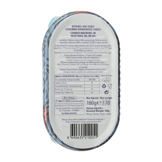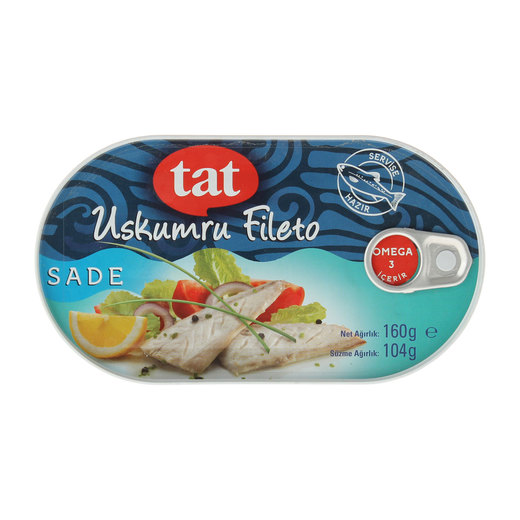 Tat uskumru fileto,pratik bir şekilde uskumru lezzetini sofralarınıza taşır.Lezzetli uskumru balığı katkı maddesi içermeden konservelenmiştir.