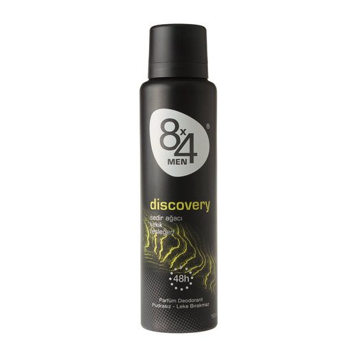 Ferah ve dinamik koku.8x4 eşsiz ve kalıcı parfüm kokularını gün boyu süren deodorant korumasıyla birlikte sunar. Discovery'nin baharatlı kokusu, ferahlatıcı meyve notuyla başlar, baharatlı ve odunsu notlarla son bulur.