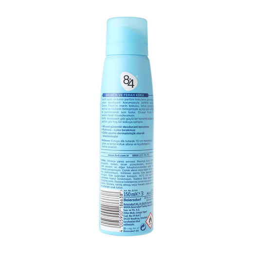 Okyanus ve ferah koku.8x4 eşsiz ve kalıcı parfüm kokularını gün boyu süren deodorant korumasıyla birlikte sunar. Ocean Fresh ile kendini ferahlamış hissedeceksin.Pudrasız,Leke bırakmaz,Ciltle uyumu dermatolojik olarak onaylanmıştır.