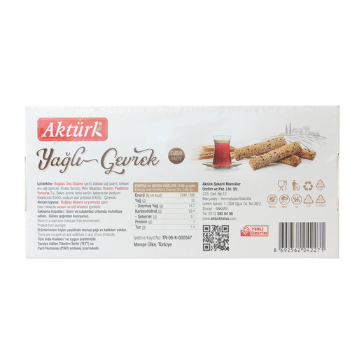 Aktürk yağlı gevrekleri, tadıyla anılmakta ve uzun süre aç bırakmamaktadır. Hem evde hem de yolda rahatlıkla tüketilebilen gevrekler, doyurucu ve lezzetlidir.