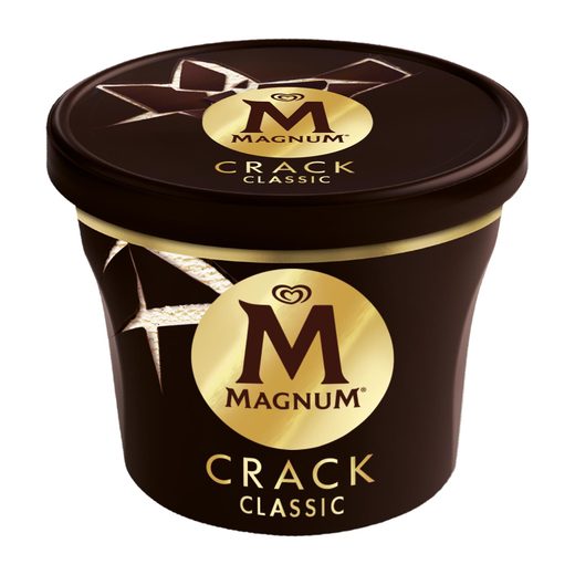 Magnum Crack Classic, pürüzsüz ve yoğun kıvamlı vanilyalı kremanın eşlik ettiği çıtır Magnum çikolata parçalarıyla size bambaşka bir dondurma keyfi sunuyor. Magnum Crack Classic, Magnum’um klasik tadını kaşıkla tadımlayabilmeniz için özel bardağında geliyor.