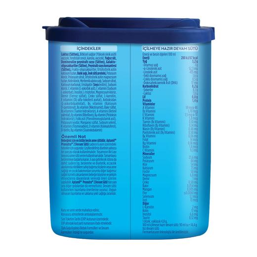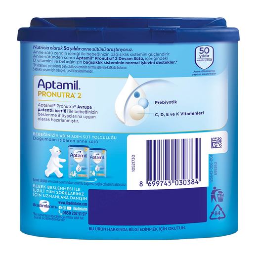 Aptamil 2 Devam Sütü’nün içeriğinde, balık yağı kullanıldığından, hazırlama ve kullanım sırasında balık yağı kokusu duyabilirsiniz.Aptamil 2 Devam Sütü ilave şeker içermez. Etiket üzerinde yer alan şekerler bilgisi mevzuat gereği zorunlu gösterim şeklidir.