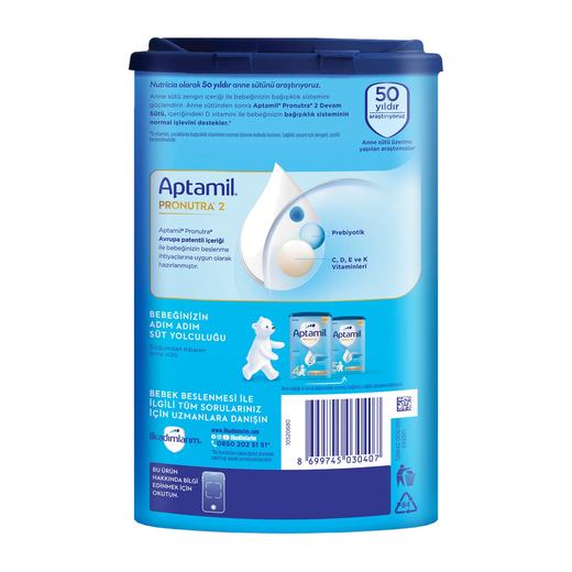 Aptamil 2 Devam Sütü’nün içeriğinde, balık yağı kullanıldığından, hazırlama ve kullanım sırasında balık yağı kokusu duyabilirsiniz.Aptamil 2 Devam Sütü ilave şeker içermez.Etiket üzerinde yer alan şekerler bilgisi mevzuat gereği zorunlu gösterim şeklidir.