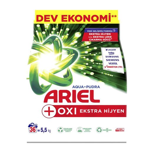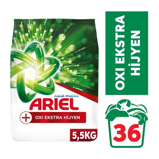 Ariel Oxi Ekstra Hijyen toz çamaşır deterjanı kalıntı karşıtı teknolojisi ile daha düşük sıcaklıklardaki yıkamalarda temizliği bir üst seviyeye taşır: Formülü ekstra leke çıkarıcılar ve ekstra köpük içerir.