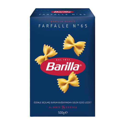 Barilla Farfalle Makarna hem sıcak hem soğuk tüm tarifler için çok lezzetli bir alternatiftir. Barilla Kelebek Makarna 10 dakikada hazırdır.Barilla Farfalle yüksek kaliteli durum buğdayından üretilmiştir.