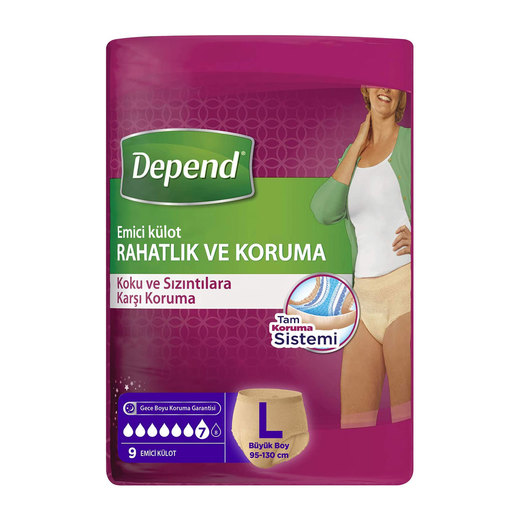 Depend,anatomik yapıya uygun tam koruma sağlar,kokuyu hapseder,elastik bel bölgesine sahiptir.