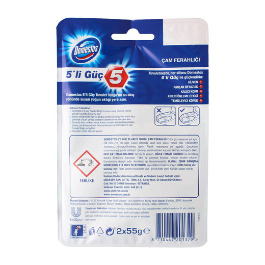 Tuvaletinizde, her sifonu Domestos 5'li güç ile güçlendirin. Hijyen, parlak beyazlık, kalıcı koku, kireci önleme etkisi, temizleyici köpük.