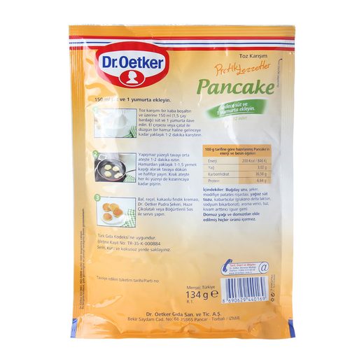 1,5 çay bardağı süt ve 1 yumurta eklenerek hazırlanıyor. Pancake hazırlaması da yemesi kadar zevkli ve kolay. Pancake'i, ister Dr.Oetker hazır böğürtlenli sos, Dr.Oetker çikolatalı sos, Dr.Oetker pudra şekeri isterseniz de bal, reçel, krema, kakaolu fındık kreması ve farklı meyveler ile tüketebiliyorsunuz.