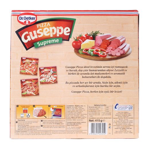 Dr Oetker Pizza Guseppe, mükemmel lezzetinin sırrını eşi benzeri olmayan, içi yumuşacık ve havalı, dışı çıtır çıtır hamurundan, birbiri ile uyumlu üst malzemeleri ve aromatik baharatlarından alıyor. Bol malzemesi ile eşsiz lezzetli DrOetker Pizza Guseppe çok doyurucu.