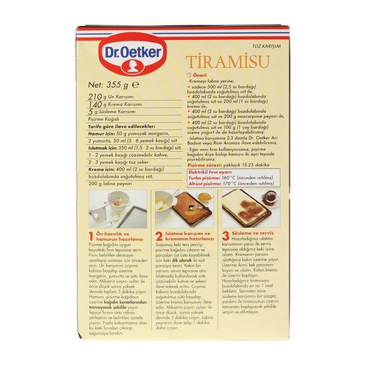 Özel krema ve süsleme poşeti ilaveli.İtalyan usulü gerçek tiramisu ! Özel kreması, süsleme poşeti, özel un karışımı ve ölçülendirilmiş pişirme kağıdı ile birlikte aynı paketin içerisinde. Kreması çırpılarak hazırlanıyor.