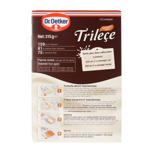 Trileçe, klasik tariflerine göre çok daha modern ve pratik.Dr. Oetker trileçe paketinde özel un karışımı, ıslatma sos karışımı ve hazır karamel sos poşeti bulunmakta.Trileçe’ye dışarıdan sadece yumurta, süt ve krema ekleniyor. Trileçe sayesinde artık internette, gazetelerde tarif aramayacak zahmetli denemelere kalkışmayacaksınız.