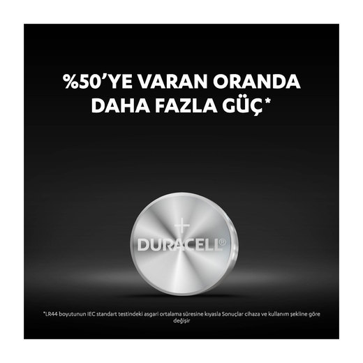 Duracell Özel LR44 Alkalin düğme piller - özel cihazlarınıza %50’ye varan oranda daha fazla güç sağlar (LR44 boyutunun IEC standart testindeki asgari ortalama süresine kıyasla. Sonuçlar cihaza ve kullanım şekline göre değişir). Oyuncaklar, hesap makineleri ve ölçüm cihazlarında kullanım için uygundur.