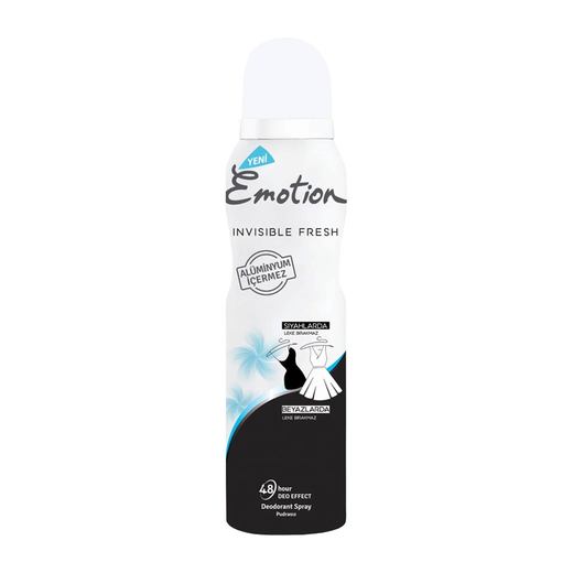 Emotion Invisible Fresh Alüminyum içermeyen ve vücudun terleme dengesini etkilemeden 48 saat koruma sağlayan formülü ile siyahlarda iz ve beyazlarda leke bırakmaz. Fresh kokusu ile taze hissetmenizi sağlar.