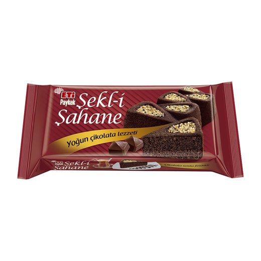 Benzersiz şekli ile Eti Paykek Şekl-i Şahane, kolayca dilimleniyor ve muhteşem bir ikrama dönüşüyor. Leziz keki, enfes çikolata sosu ve fındık parçacıkları ile sevdiklerinize ve misafirlerinize bir lezzet şöleni sunuyor.